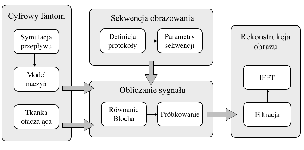 Obliczenia wykonywane w jądrze symulacji bazują na równaniu Blocha, które stanowi klasyczny opis zjawiska NMR. Równanie to posiada rozwiązanie analityczne definiujące stan wektora magnetyzacji $\mathrm{\textbf{M}}$ cząstki $p$ w chwili $t$ w zależności od stanu w kroku poprzednim ($t-\Delta t$) jako $$\mathrm{\textbf{M}}_p(t) = Rot_z(\theta_g)Rot_z(\theta_i)R_{\mathrm{relax}}R_{\mathrm{RF}}\mathrm{\textbf{M}}_p(t-\Delta t),$$ gdzie operator $Rot_z(\theta_g)$ odpowiada gradientowi kodowania fazy, $Rot_z(\theta_i)$ powoduje obrót wektora magnetyzacji w wyniku niejednorodności pola magnetycznego, $R_{\mathrm{relax}}$ uwzględnia zjawiska relaksacji wzdłużnej i poprzecznej, człon $R_{\mathrm{RF}}$ jest natomiast odpowiedzialny za obrót wektora magnetyzacji wokół osi y (pobudzenie). Należy zwrócić uwagę, że prawidłowe wyznaczenie nowego stanu wektora magnetyzacji wymaga określenia położenia cząstki względem środka gradientu. W przypadku poruszających się cząstek, stan wektora $\mathrm{\textbf{M}}_p$ należy aktualizować w odstępach czasowych pozwalających zachować precyzję zarówno symulacji przepływu, jak i zjawiska rezonansu magnetycznego. W wykonanych eksperymentach, krok ten ustala się zgodnie z interwałem czasowym dla próbkowania sygnału. Sama operacja próbkowania w obrębie jednej repetycji polega natomiast na sumowaniu wektorów magnetyzacji poprzecznej wszystkich cząstek w $N_x$ krokach czasowych, zgodnie z równaniem $$s(t) = \sum_{p=1}^{n_p}\vec M_p(t)\vec x + j\sum_{p=1}^{n_p}\vec M_p(t)\vec y,$$ gdzie $N_x$ oznacza liczbę wokseli obrazu w kierunku kodowania częstotliwości, zaś $n_p$ – liczbę cząstek. W ten sposób wypełniany jest jeden rząd w tzw. zespolona przestrzeni danych k-space. Częstotliwość próbkowania stanowi zatem iloraz liczby punktów próbkowania $N_x$ oraz długości okna akwizycji. Kolejne rzędy wypełniane są w $N_y$ oraz – w przypadku obrazów 3D – $N_z$ krokach kodowania fazy, przy czym każdy krok kodowania fazowego odbywa się w oddzielnych repetycjach sekwencji pomiarowej. Rekonstrukcja obrazu