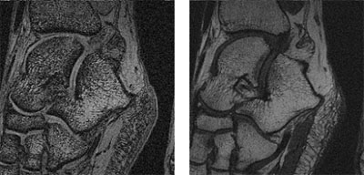 | Rys. 8 Obraz MRI poprzecznego przekroju przez stopę, zarejestrowany dla sekwencji Flash (a) oraz 3D Spin echo (b) |