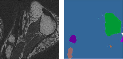 | Rys. 9 Obraz MRI poprzecznego przekroju przez stopę (a) oraz wynik jego segmentacji (b) |