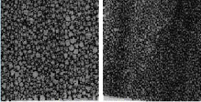 Niezależnie, dla porównania z obrazami MRI, do wstępnych badań wykorzystano optyczne obrazy pian. Są to zeskanowane obrazy rzeczywistych pian przedstawiające ich przekroje poprzeczne. Zarejestrowano je dla dwóch rodzajów pian o różnej porowatości. Rys. 4 przedstawia obraz piany o dużej porowatości (po lewej) oraz pianę o średniej porowatości (po prawej).
